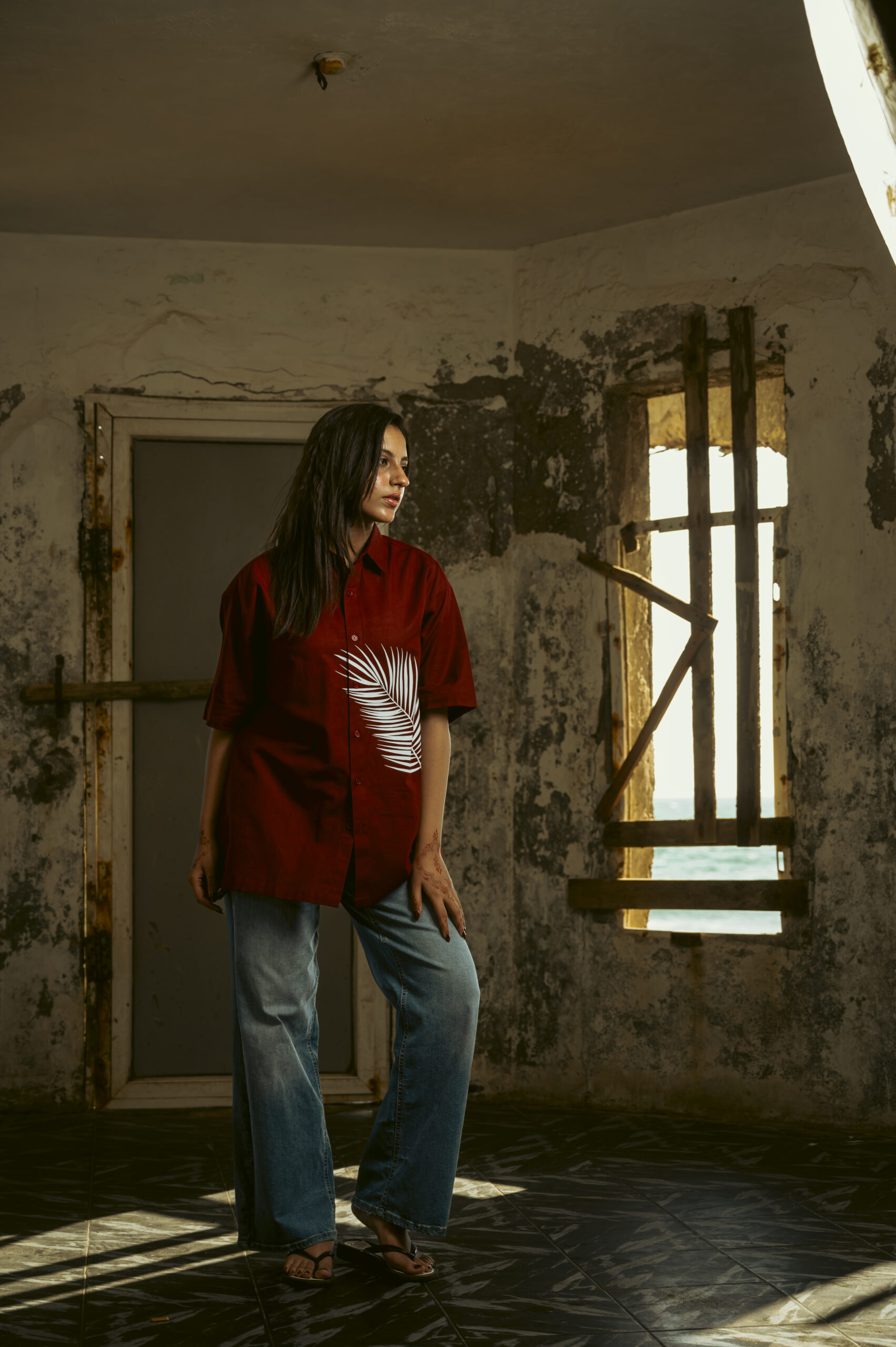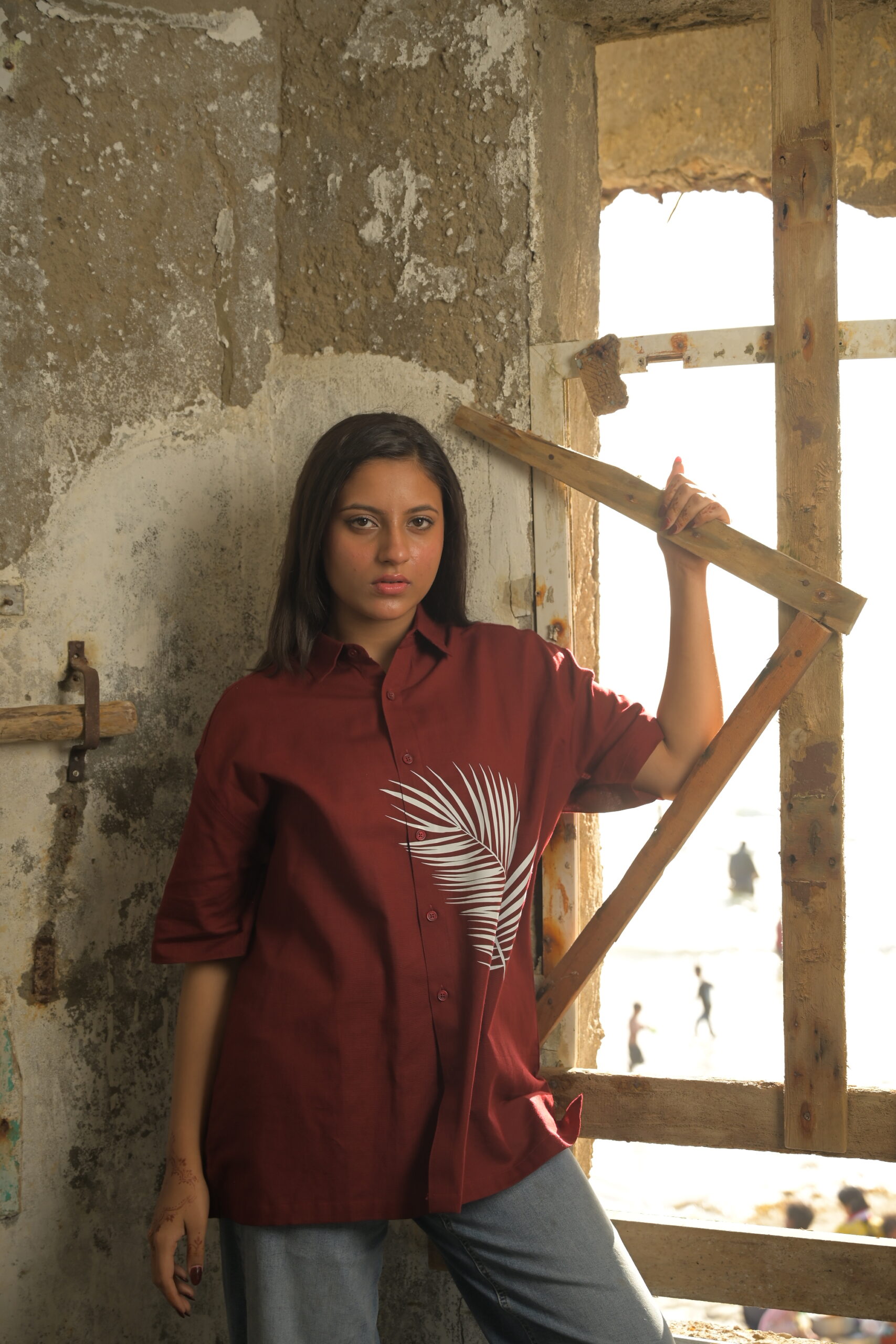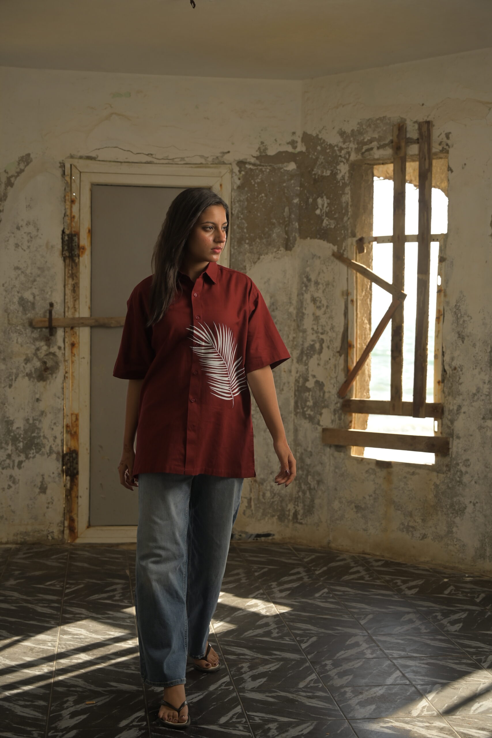 Make a bold statement with our deep maroon unisex button-down shirt, crafted from premium Irish fabric known for its breathability and comfort. Featuring a relaxed fit and a striking white palm motif, this piece blends contemporary design with effortless style. Perfect for casual outings or laid-back weekends, pair it with jeans or trousers for a versatile look that stands out on anyone.